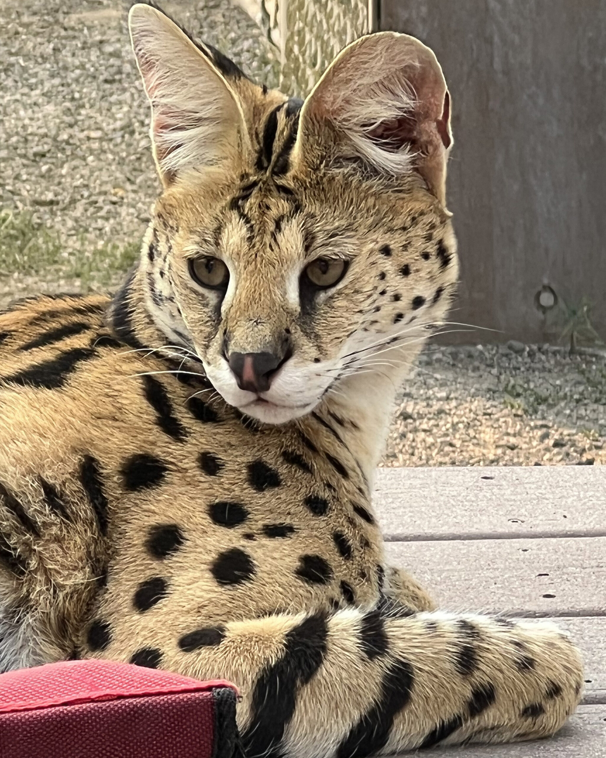 Born April 7, 2019, Ozzy arrived at Cat Tales in December 2020 after his family made the compassionate decision to rehome him. They loved him deeply but faced changing regulations regarding serval ownership in their area. Rather than risk his confiscation or euthanasia, they placed his welfare first—entrusting him to Cat Tales for a permanent, safe, and enriching home.