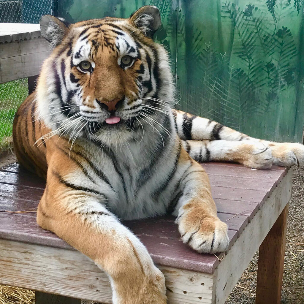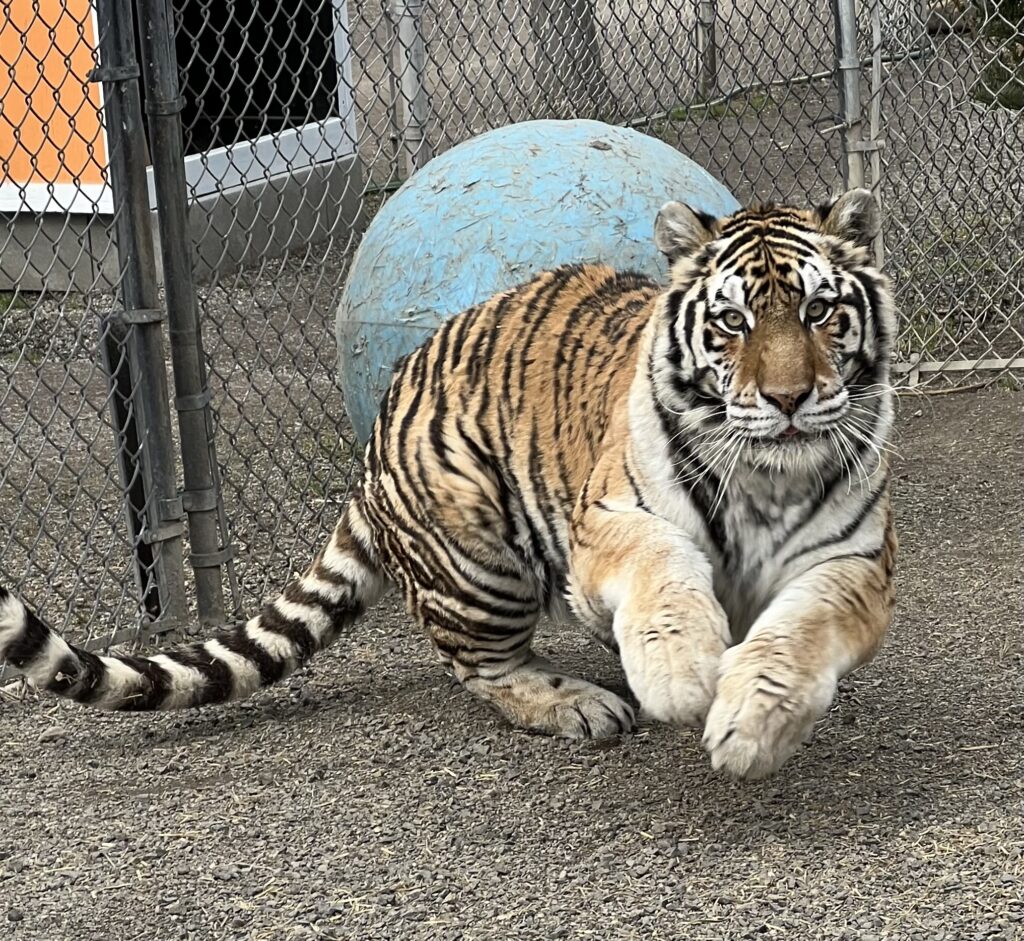 Born November 24, 2007, Koshka is one of four siblings (Sestra, Malenky, and Tuga) and the largest tiger at Cat Tales. His name translates from Russian as “cat” or “kitten”—a fitting choice for a 650-pound feline who still enjoys playtime like a housecat.